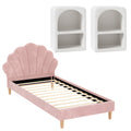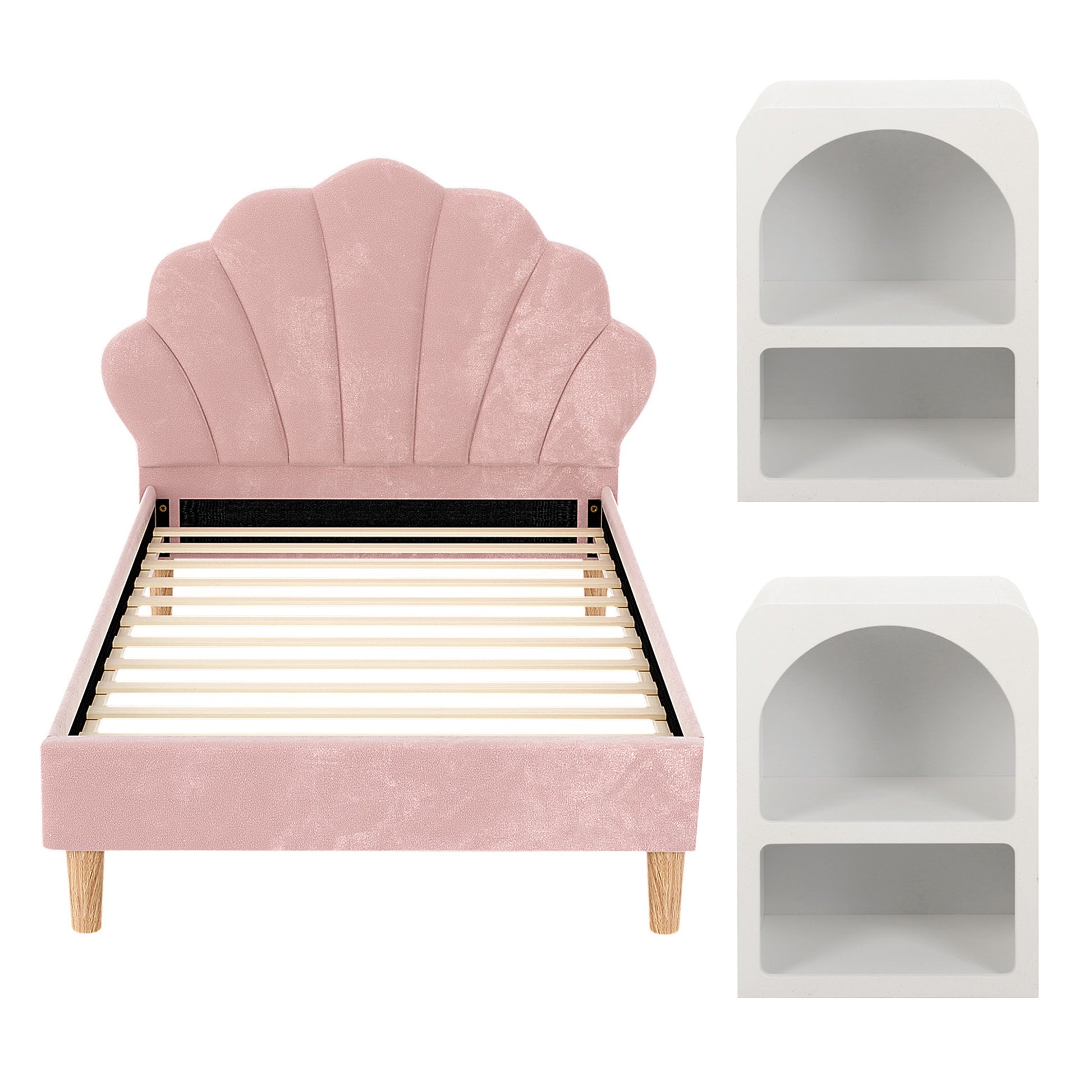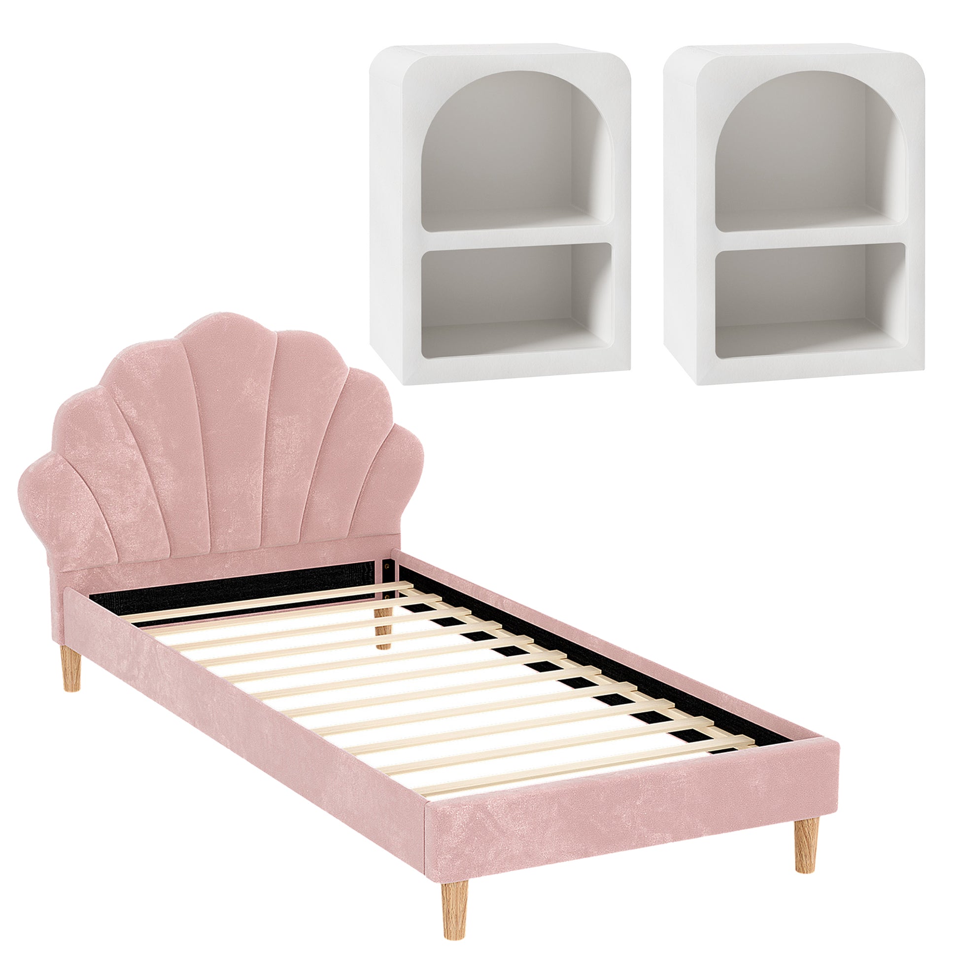 Walk into your bedroom and the soft pink velvet of the scallop headboard immediately catches your eye. The velcro-enabled slats keep your mattress securely in place while the smooth safety-finished edges add a refined touch to the overall design. The two included bedside tables offer open shelving and sturdy tabletops rated for everyday use.