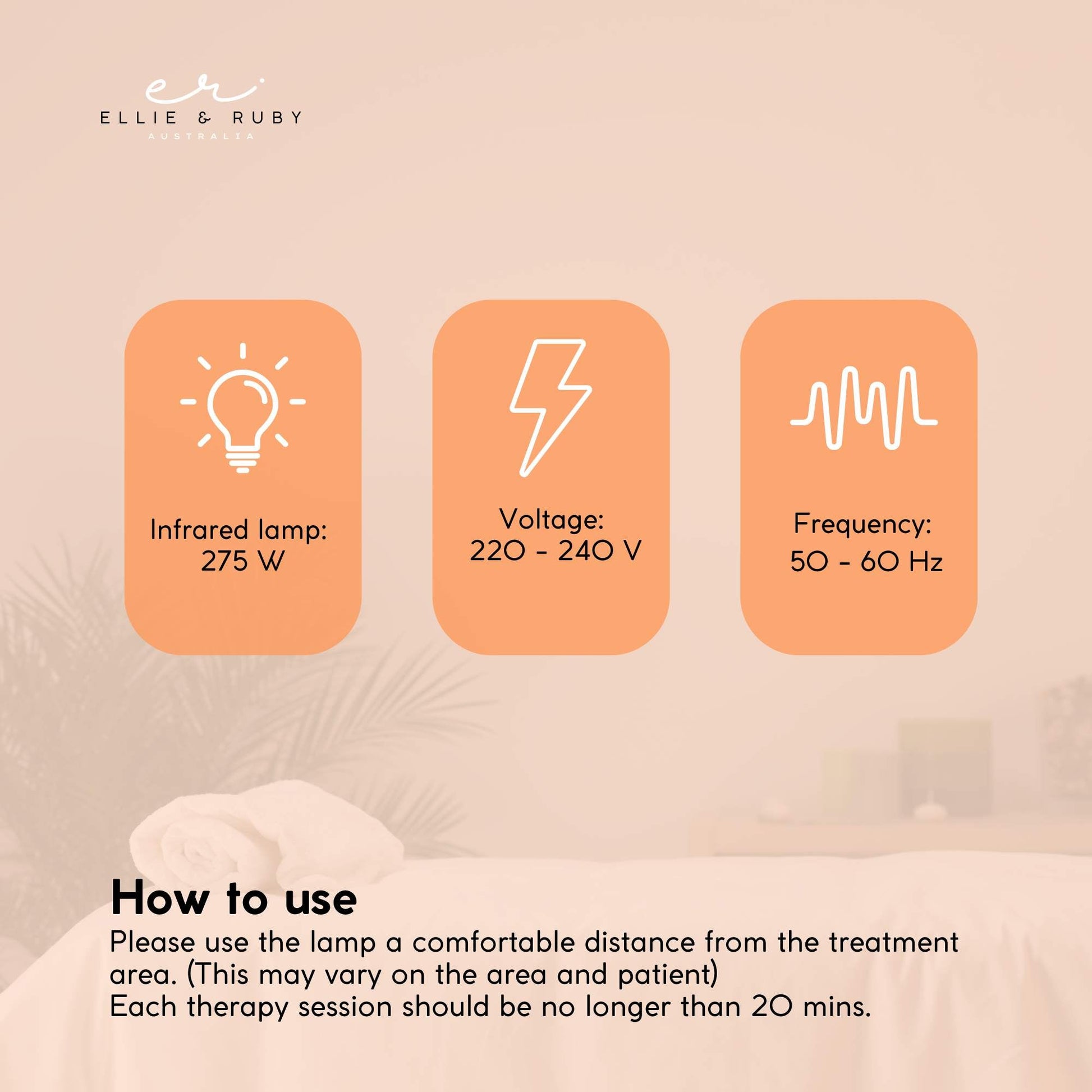 Please Note: Avoid staring at the light bulb for too long. Do not touch the light bulb when it is too hot during or after use. Each therapy session should be no longer than 20 minutes. Maintain a comfortable distance from the treatment area at all times.