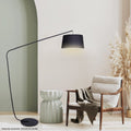Sarantino arc floor lamp in sleek black matte finish with linen taper shade, inspired by iconic mid-century design. The wide-reach arm positions overhead lighting over desks and dining tables without the need for pendant installation.