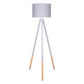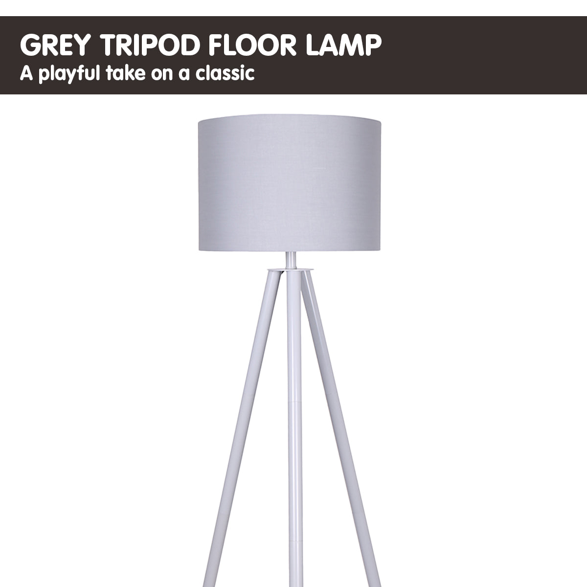 Arc floor lamp with height adjustable design on a classic tripod stance. Grey painted metal legs and rubberwood tips pair with a fabric drum shade to suit contemporary and modern interiors. Eco-friendly rubberwood leg tips soften the look for urban, casual or updated lodge spaces.