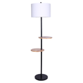 Shelf floor lamp combining illumination with built-in storage. Two round wooden shelves sit on opposite sides of a black metal post, allowing you to display decorative items or store everyday essentials like remotes and smartphones. White drum shade casts an even, diffused glow on a stable metal base.