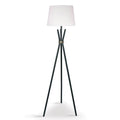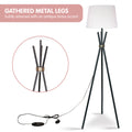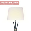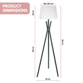 Mid-century tripod floor lamp with antique brass neck accent and off-white linen drum shade. Black metal legs gathered at the neck provide a stunning silhouette, while the modified drum shade casts a warm, inviting glow. Perfect for living rooms, bedrooms and reading corners.